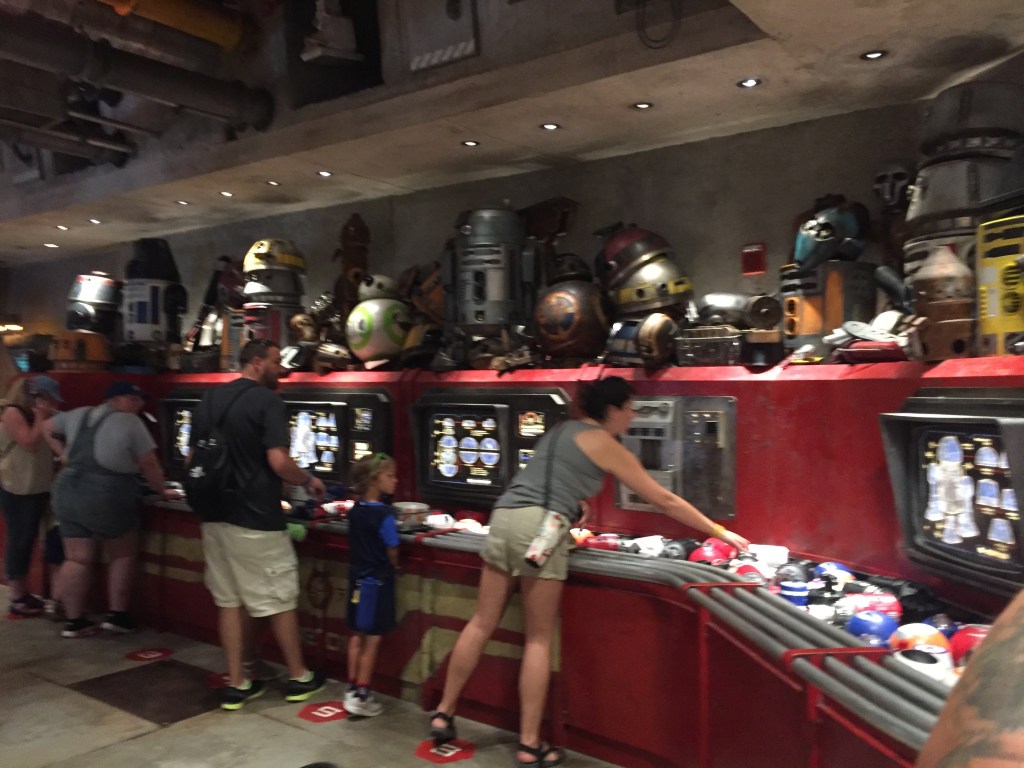 You can’t go to Disney let alone Galaxy’s Edge without buying something to bring home. There are lots of small themed gift shops selling everything you can dream of stars wars wise for children and adults. Of course this is Disney, Orlando so nothing is cheap. Souvenirs start at around $10 but you can spend a couple of hundred to build a custom Light Sabre or a custom built droid. Choose parts for your droid from a conveyor belt at your leisure and complete it with custom colours, stickers and an interactive chip.
