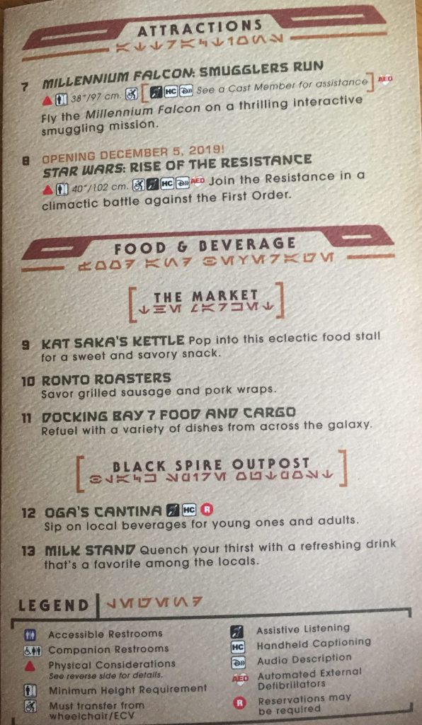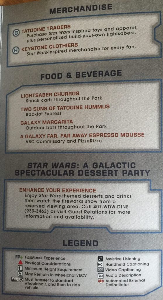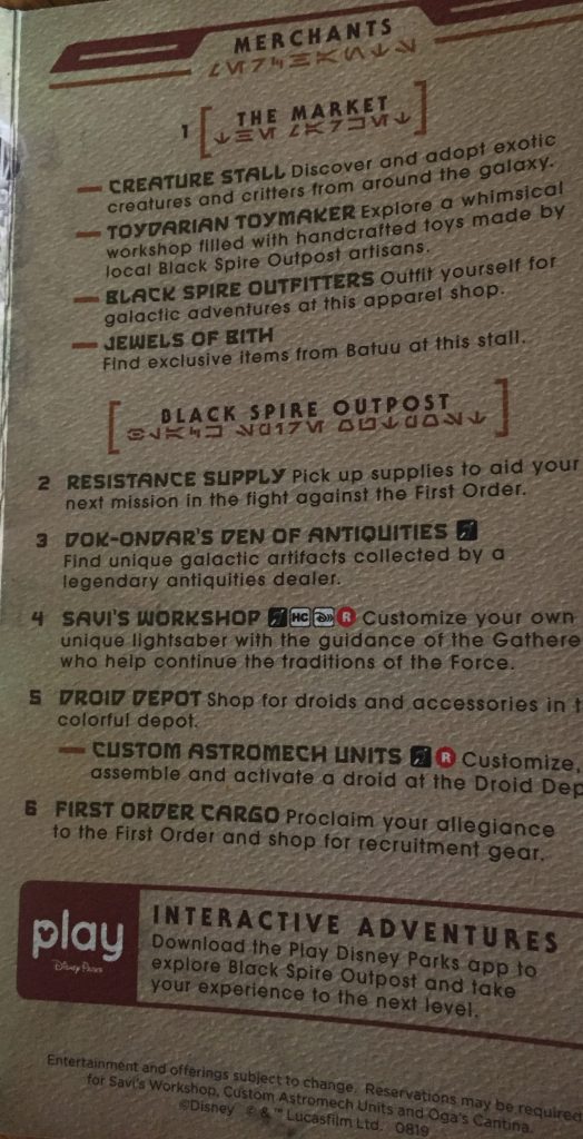 We were handed a souvenir Guide as we entered Galaxy’s Edge. Please see map showing location of shops and places to eat at the bottom of my post.